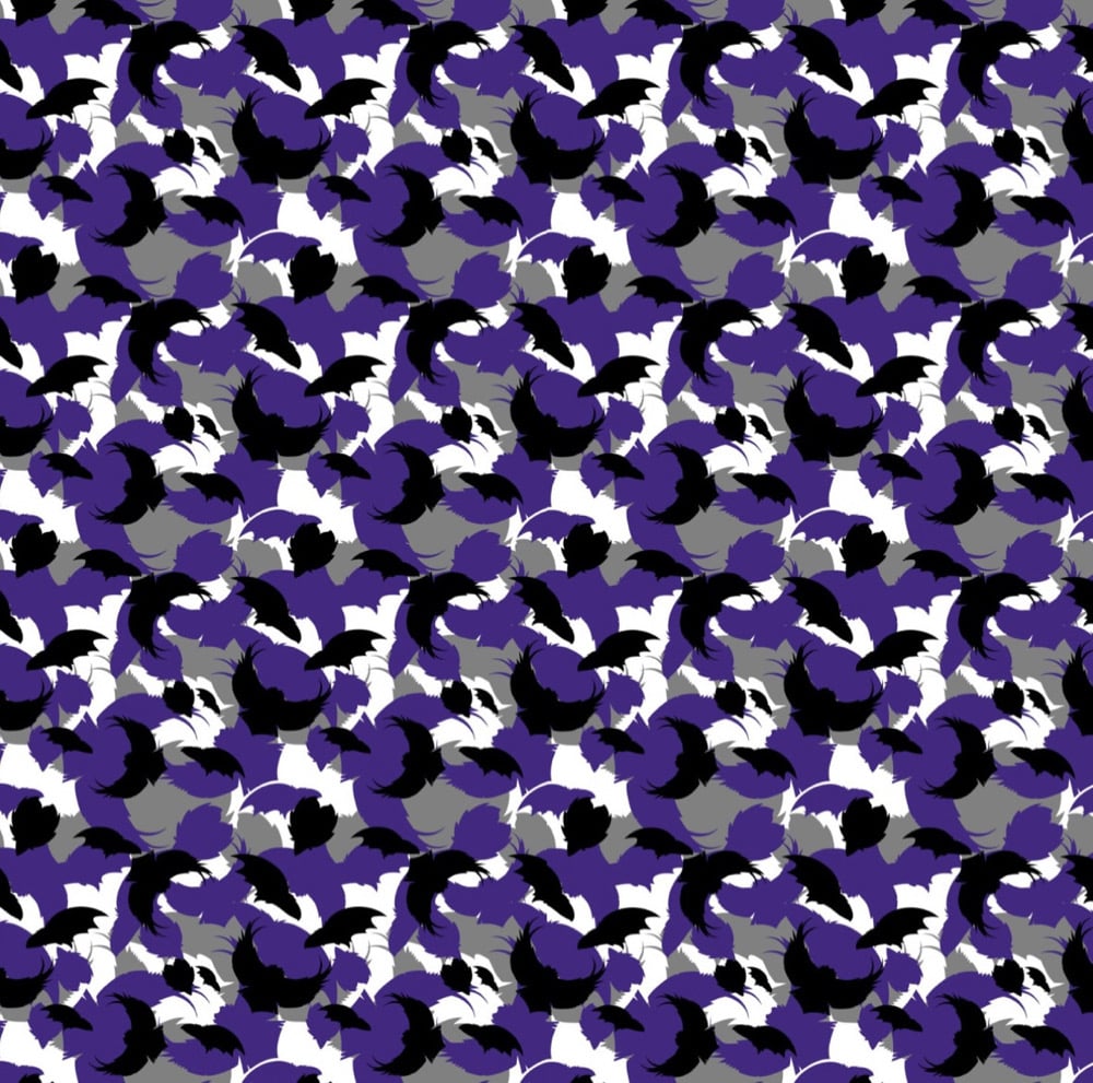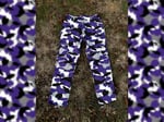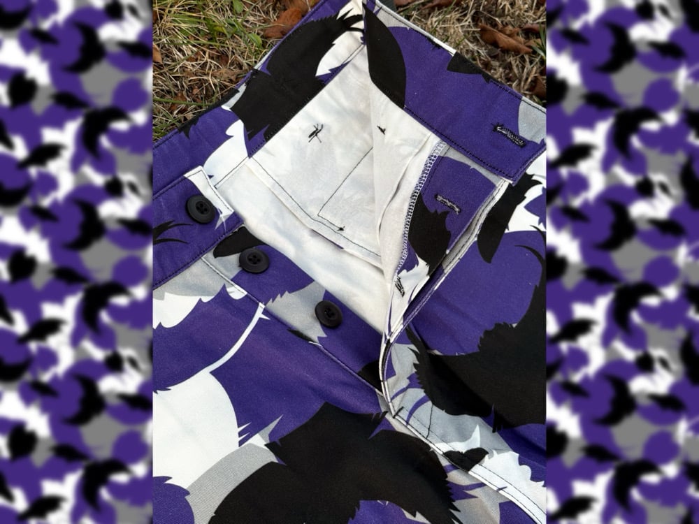 The iconic Purple Camo Cargo pants featruing a custom “Baltimore Bird” Camo pattern made up of the Ravens bird logos throughout the years. Button Fly fastened with adjustable straps to accommodate fit. Please see waist and inseam measurements in parentheses next to the size selection. *THIS IS A PRE-ORDER ITEM! PLEASE ALLOW (roughly) 3-4 WEEKS OR SO TO MANUFACTURE, PROCESS, AND SHIP*